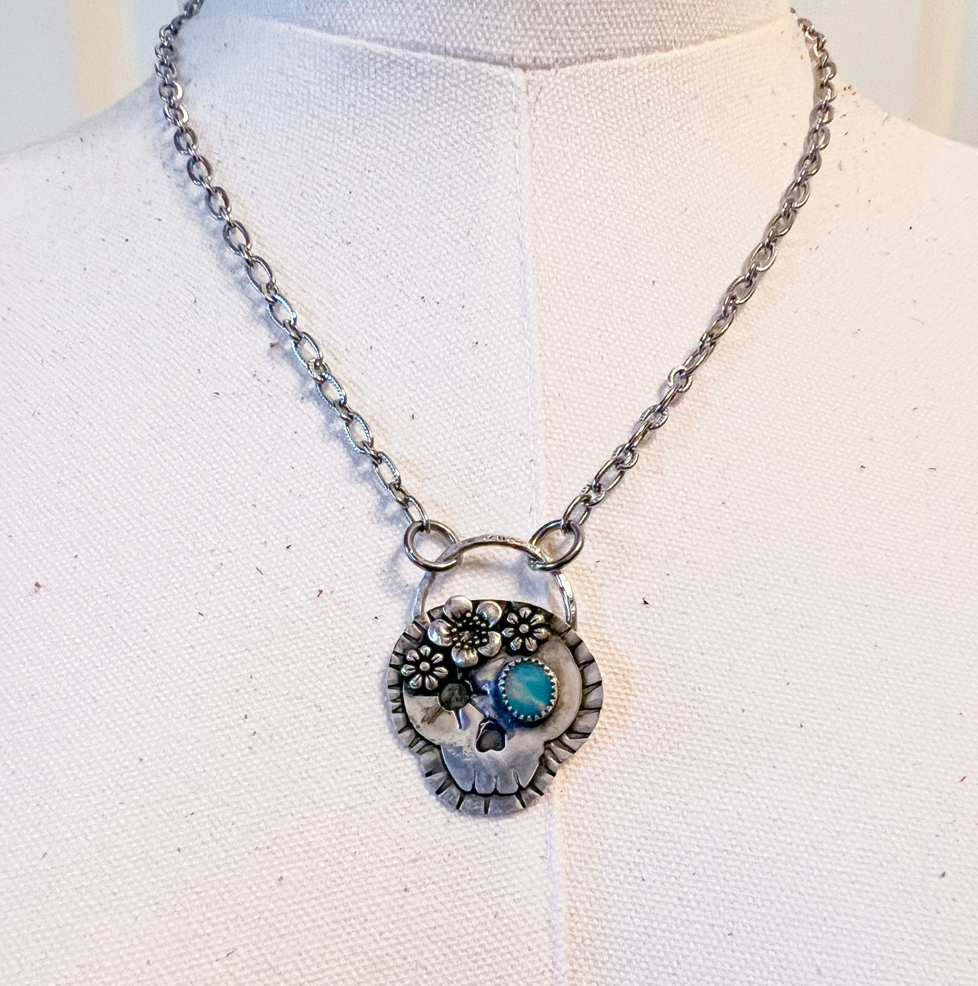 Hand cut and stamped Sterling Silver with an opal “eye”.